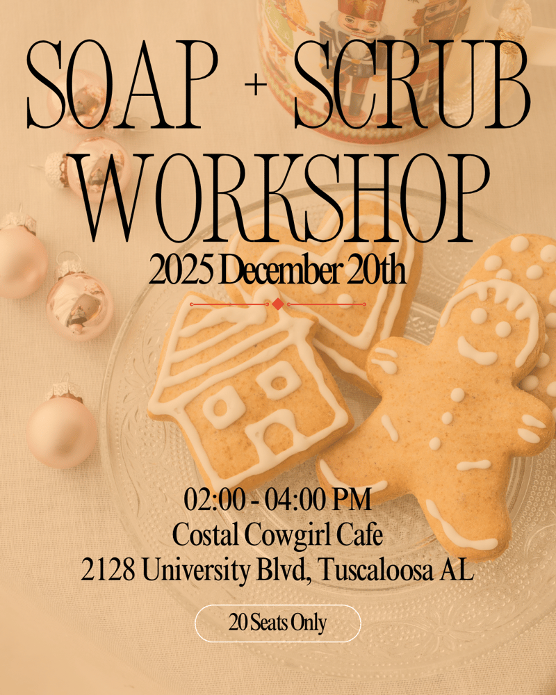 Join NK Skincare for a cozy hands-on workshop at Costal Cowgirl Cafe! Learn to make your own Gingerbread Glow soap and sugar scrub, blending warm notes of ginger, cinnamon, and vanilla.